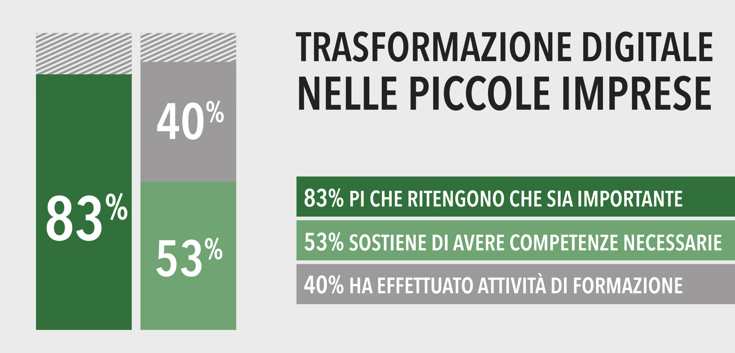 Adeguare le competenze e le conoscenze a livello aziendale per fronteggiare i cambiamenti della società e del mercato è ormai una consapevolezza anche per molte PMI, eppure si investe ancora troppo poco in formazione. L’Indagine sui processi di Trasformazione Digitale nelle Piccole Imprese svolta da CNA evidenzia come l’83% delle imprese intervistate ritiene che lo sviluppo e l’inserimento di competenze adeguate sia importante, ma solo il 53% sostiene di avere le competenze necessarie per affrontare le sfide dell’innovazione e della trasformazione digitale, e poco meno del 40% ha effettuato attività di formazione.
